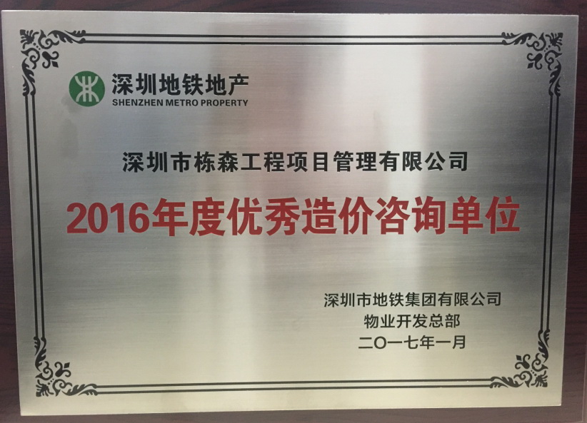 深圳市地鐵集團有限公司物業開發總部2016年度優秀造價咨詢單位